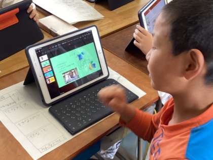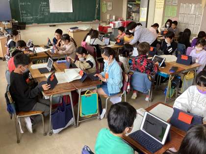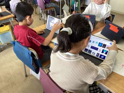 総合的な学習の時間で、4年生はプレゼンテーションソフトを使って、自己紹介を作成していました。自分の何を伝えたいのか、より分かりやすく伝わるように、イラストや写真を取り込んでいました。友達に楽しそうに教える姿が見られました。