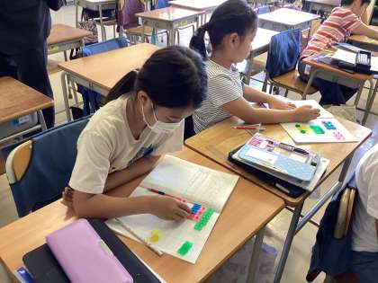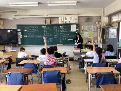 「わりざん」の学習をしています。今日の問題は 24÷3 。少人数のクラスでは答えを求めるためにおはじきを使って確かめをしたり、友達と色々な考え方を交流したりしています。「昨日のやり方が使えるね」「◯◯さんの考え方と同じだね」既知の学習を生かしたり、友達との交流を通して、学びを深めています。