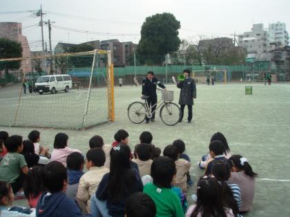 東玉川小学校では、毎年3学期に2年生を対象とした自転車教室を行っています。そして3学期の終わりに、自転車教室修了証をもらい、3年生になったら交通ルールを自分で守りながら自転車に乗るようになります。今日は、玉川警察署の交通課の方に来校していただき、安全な自転車の乗り方について教えてもらいました。