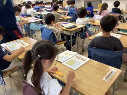 1年生は「いくつといくつ」の学習をしています。今日は「7」の構成について考えました。サイコロゲームやブロックならべなど、活動を通して合成や分解を繰り返し、定着を図っています。