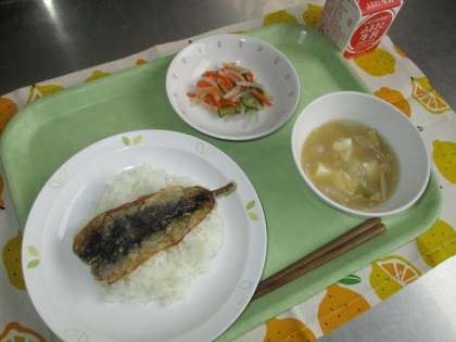 東玉川小学校の調理員さんは揚げ物がとても上手です。立派ないわしの開きをカリッと揚げてくれました。甘辛いたれに一枚ずつ丁寧にくぐらせ、尻尾まで味のしみたかば焼を仕上げてくれました。白いごはんとの相性は抜群でしたね。