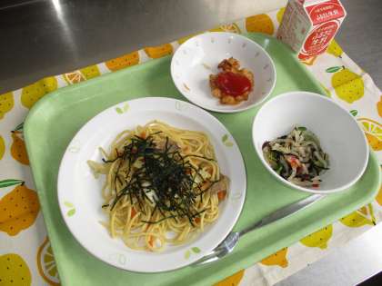今日も繊維質な食材を沢山取り入れています。スパゲティにはえのきたけと海苔、サラダにはひじき、フリッターには大豆を使用しました。きのこ、海藻、豆は野菜の中でも食物繊維の含有量がトップクラスです。和風にアレンジすることは日本の食材を楽しむだけでなく、体にも嬉しい事が沢山ありますね。