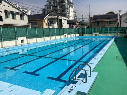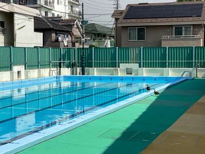6月半ばから始まる水泳指導に向けて、プール清掃が終わりました。濾過器の点検を待つプールサイドには例年通りカワイイ鴨が休憩していました。