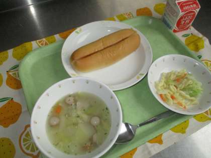 生活習慣病を予防するために塩分の取りすぎには注意しようという考えがあります。給食では1食あたり2g以下の塩分量を目指しています。今日は無塩パンを使用しました。普段のパンには1g弱の塩分が含まれるため、大幅に塩分量を控えるとこができました。少しの塩分でも美味しいと思えるようになって欲しいと思います。