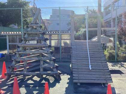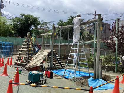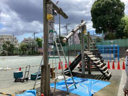 長年親しまれてきた木製遊具ですが、経年劣化のため、ターザンロープや遊具の緩み等、子供達が安全に楽しく遊べる遊具としては不十分な点がありました。修繕や撤去などについて話し合い、ターザンロープは撤去、タワーは修繕する方向で決定し、本日、修繕をいたしました。慣れ親しんだ遊具とお別れするのは寂しいものですが、リニューアルしたタワーはこれからも子供達の楽しめる遊具として活躍してくれることでしょう。
