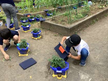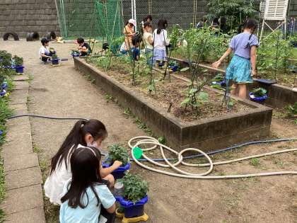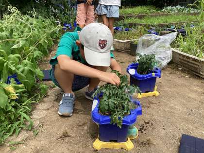 生活科「ぐんぐんそだて おいしいやさい」の学習で野菜を育てています。今日は自分のトマトの観察と脇芽を抜いてお手入れをしました。