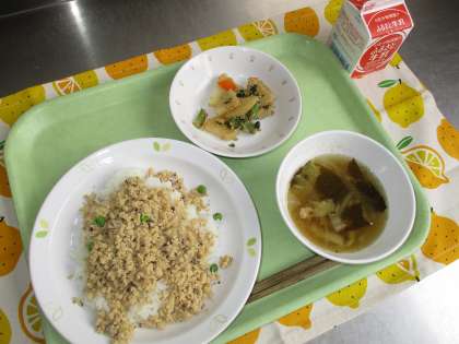 そぼろには鶏むね肉の他に凍り豆腐を砕いたものが入っています。たんぱく質量はキープしたまま脂質の摂取量をおさえています。