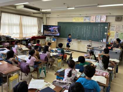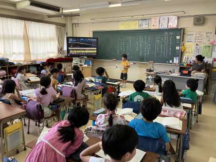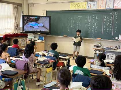 2年生の教室では国語の学習でスピーチをしていました。「メモをとるとき」の学習で、お友達の好きなものを聞き取り、そのメモを元に皆に紹介をしました。相手に伝わる声の大きさや速さ、相手を見てきちんと発表ができていました。