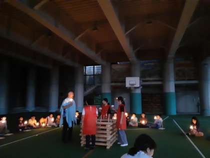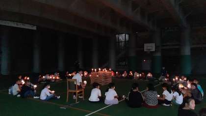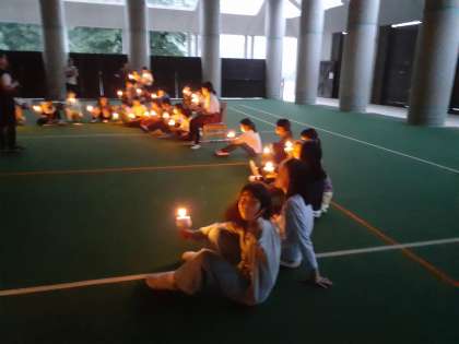 午後の雨もあり、予定変更。キャンプファイヤーからキャンドルファイヤーに。子どもたちは 火の神から、友情、希望、努力の火をもらいました。