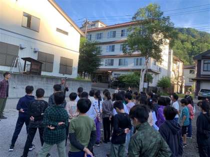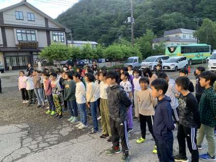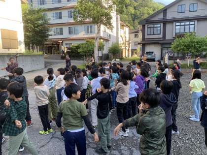 2日目の朝は、いいお天気です。「今日も安全に気を付けて楽しく過ごしましょう」と朝会の挨拶の後は、綺麗な空気を思いっきりすって、朝の体操です。