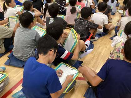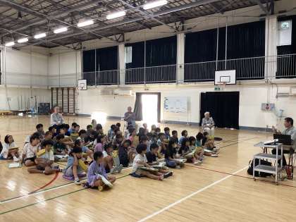 明日、虫とりでご指導くださる城南環境学習支援グループの皆様と、事前学習を行いました。昆虫の特徴や生態などについて、プレゼンテーションをしてくださいました。虫の区別における、日本と外国との違い、外国同士の違いなど、わかりやすい説明に子どもたちも納得の様子でした。明日は天気になりそうですね。