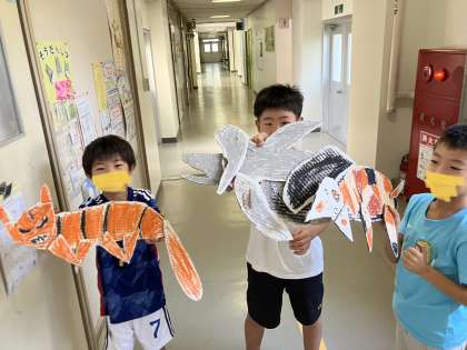 校内の巡回を終えて1階に降りると職員室の前に子どもたちの姿がありました。「先生、見てください!」図工の時間に作った作品を見せにきてくれていたようで、笑顔で作品について話してくれました。「ハンマーシャーク、ねこ、タイガー」皆、上手に作ることができています。