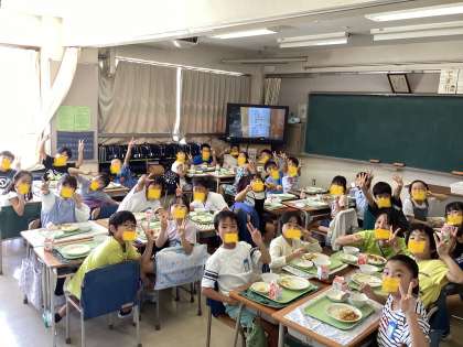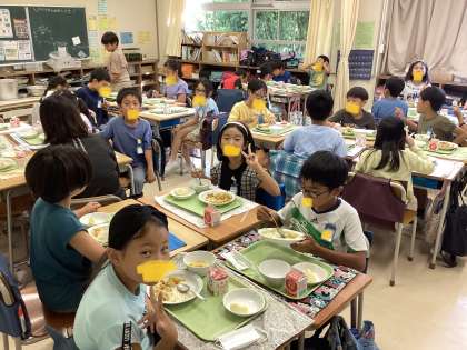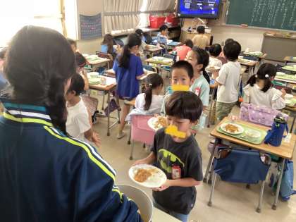 今日の給食は、みんな大好きカレーライス!「ちょっとピリ辛だけど、おいしかった」という感想の通り、食べてるお教室のみんなは、美味しそうに食べていました。おかわりもたくさんして、ピカピカの食缶になっていました。