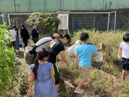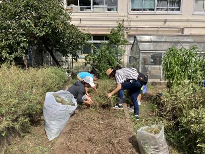 今日は「常緑会」と「さいばいDAY」でした。学級代表で参加した子どもたちと、常緑会の保護者の方が一緒に教材園の整備を行いました。日差しが強い中ではありましたが、皆で協力して楽しく活動することができました。「立派なナスがなっています」2年生の畑で実を付けているナスを見付けて、嬉しそうに報告してくれたお友達もいました。