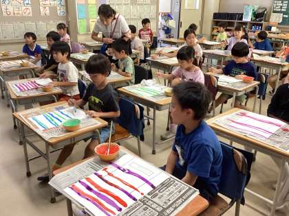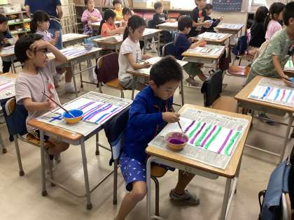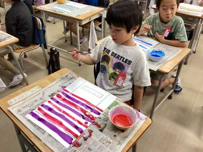絵の具を使ってストライプのTシャツ作りをしています。今日は好きな色で丁寧にストライプを塗りました。