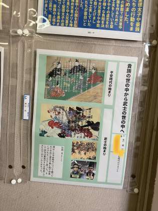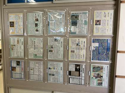 教室前廊下に歴史新聞が掲示されています。数年前の新聞とは違って、今は全てタブレットで作成しています。背景やフォント、写真の活用が容易になったことで、見栄えがよく、手書きとはまた違った良さが感じられる一人一人の個性溢れる作品がならんでいます。