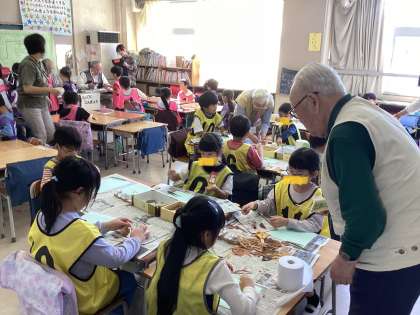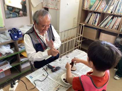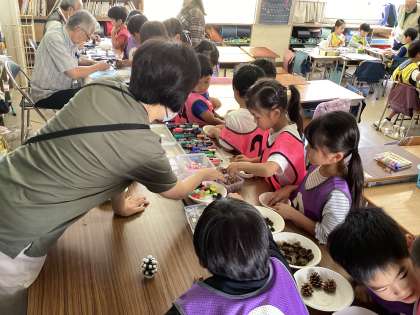 先日、洗足池公園で拾ってきたドングリや落ち葉を使って工作を行いました。自分で作ってみたい木の実や葉っぱを組み合わせたり、型の切り抜きをしたりして、思い思いの作品を作っていました。子どもも大人もとてもいい笑顔です。
