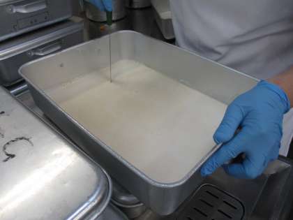 今日の杏仁豆腐は牛乳をたっぷり入れました。上のお写真は固まった杏仁豆腐を切り分けているところです。一つ一つひし形になるように慎重に作業してくれています。