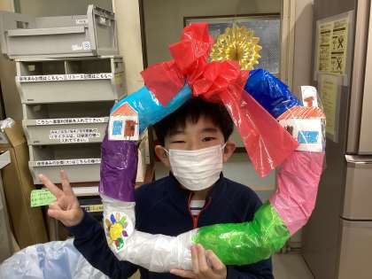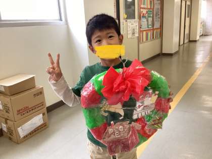 図工の時間にリースを作りました。カラービニールを巻いたり、イラストを描いたりして、自分のお気に入りのリースを完成させました。「先生にプレゼントです。いつもありがとうございます」と感謝の言葉とリースをいただき、涙が出そうなくらい、嬉しかったです。2年生がんばっています。