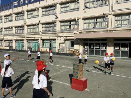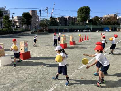 ダンボールの的をめがけて、ボールを投げる子どもたち。「今日はこれを一番楽しみにしていたんだよね」と教えてくれた通り、的に当てることができた時の喜びの姿が印象的でした。色々なボールの投げ方を通して、より投げやすい投げ方をさぐっていました。