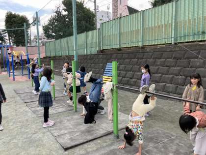 気持ちの良い青空の下、校庭で元気に遊ぶ子ども達。体育の時間に取り組んでいることもあり、今は鉄棒が大人気です。前回り、空中逆上がりにコウモリ振り。みんな「見て、見て」とできる技をいっぱい見せてくれます。「逆上がりのやり方、忘れちゃった。どうやってやるんだっけ」といっていた子も、みんなで楽しく取り組むと「あれ?できちゃった」と。何事も、みんなで楽しく取り組むって大事ですよね。