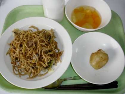 塩味の「焼きそば」、新じゃがを皮ごと蒸して、バターじょうゆにからめて焼いた「じゃがバター」、国産の果物のみを使った「フルーツポンチ」は、どれも大人気でした。1年生をはじめ、多くのクラスがからっぽで食缶を返してくれました。
