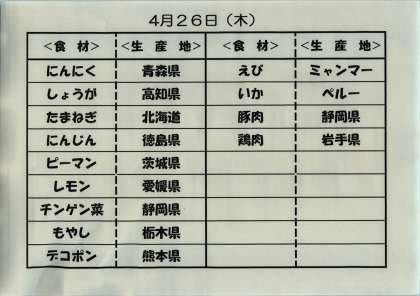26日(木)の給食は、「ナシゴレン、ヌードルスープ、でこぽん、牛乳」です。献立予定表では、「キウイフルーツ」となっていましたが、「でこぽん」に変更になりました。