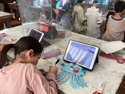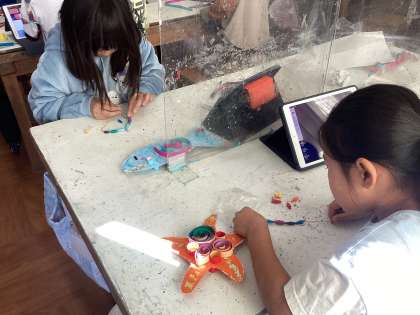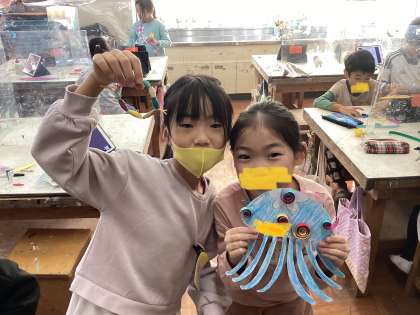 くるくると巻いた色画用紙をボンドで付けて作った物にゴムを付けて組み合わせていくと、素敵なかわいいブレスレットができました。他にも、魚やクラゲ、イルカなど、自分で描いた作品に貼ると、こちらも素敵な作品の出来上がり。完成した作品を嬉しそうに見せてくれました。