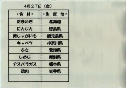4月26日の給食と27日の給食食材の産地について
