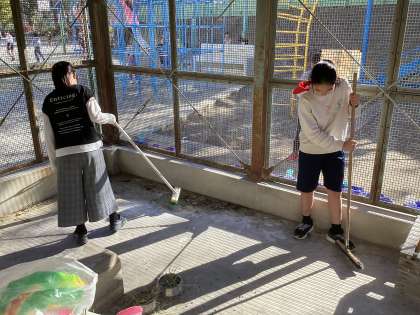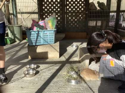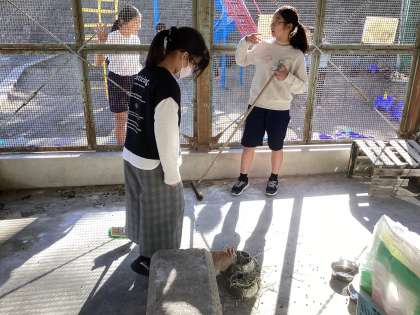ウサギ小屋では、委員会の登板のお姉さんがお掃除をしてくれています。明日の土曜日はウサギふれあい企画があり、権利を獲得できた子がウサギ小屋を訪ねてきます。気持ちよく触れ合ってもらえるために、また、ウサギが健康的で衛生環境のよい状況下で暮らせるように、日々がんばっている委員さんたちです。