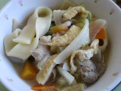 山梨県の郷土料理“ほうとう”は平らにきった麺をたっぷりの具とともに味噌仕立ての汁で煮込んだお料理です。この季節にぴったりの体の温まる汁物です。