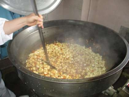 四川豆腐には形のきれいな、四角いままのお豆腐がたくさん入りました。調理員さんによるとお豆腐が崩れないかき混ぜ方があるとのこと。また“す”が入らないように、加えるタイミングにも神経をつかいます。プロの技が光る一品でした。