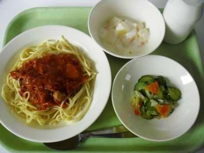 スパゲッティーにかけたトマトソースは大変好評でした。給食室で、野菜や鶏肉などを炒め、トマトの水煮缶、トマトピューレ、トマトペーストなどを加えてよく煮詰めて作りました。