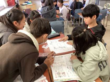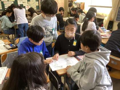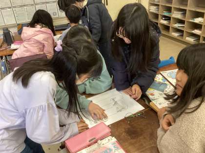 「ミシンの使い方」の学習では「福笑い」を通してミシンの各パーツの名称を覚える学習にチャレンジしました。友達の指示に従って、パーツを動かしていきます。うまく置くことができた子ども達からは、「やったー!」と嬉しそうな歓声も聞こえてきました。