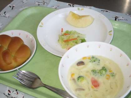 コーンシチューには牛乳やバター、チーズがたっぷり入り、コクのある仕上がりになりました。あしたばの香りがのほのかに香るパンにも相性ばっちりでした。