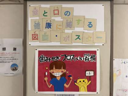 そして「歯と口の健康に関する図画ポスター展」で見事「教育長賞」を受賞した児童の表彰も行いました。素敵なポスターが保健室前に掲示されています。是非ごらんいただければと思います。
