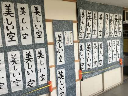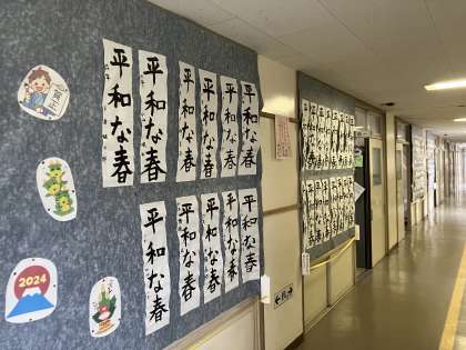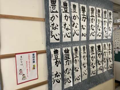 先週より、校内書き初め展が開催されています。各学級の前に張り出された作品は、それぞれの発達段階が感じられる素敵な作品に仕上がっています。「やっぱり太いと目立ちますね」「〇〇さん、すごくきれいに書けてませんか?」子ども達も作品を見ながら、それぞれの感想を話し合っています。ご来校いただき、是非ご覧ください。 写真は4、5、6年の作品です。