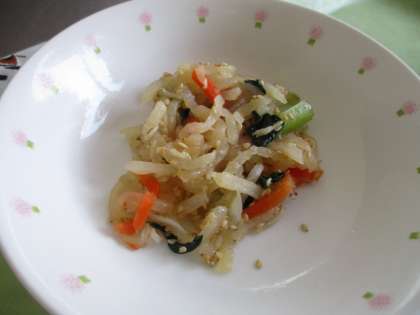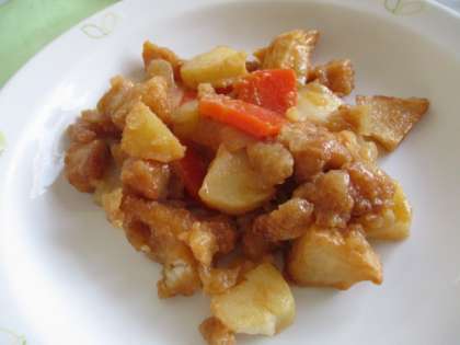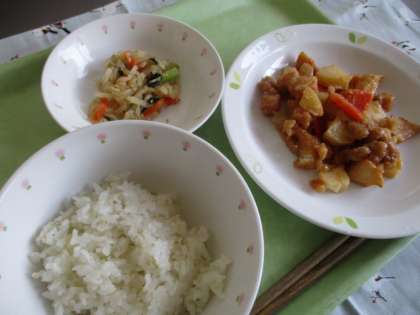 油でカリッと揚げた鶏肉とじゃがいもにケチャップと赤味噌ベースのソースをからめました。チャップとお味噌なんて意外な組み合わせですが、「あうね〜!」と喜んでいただけました。ごはんもおかずもとても残食が少なく完食のクラスも目立ちました。