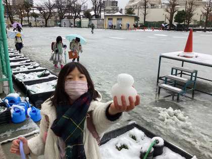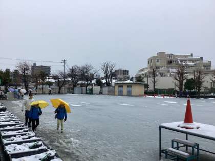 昨晩の大雪で、今朝の学校は雪に包まれていました。子ども達の登校時に怪我をしないよう、職員一同、雪かきを行いました。子ども達の登校時には、歩くことができる道を確保できました。登校した子供達は、「校庭で遊んでいいですか」と。今日の雪は残念ながら、遊べる雪ではありませんね。ビチャビチャの雪を手に、納得顔の子ども達でした。