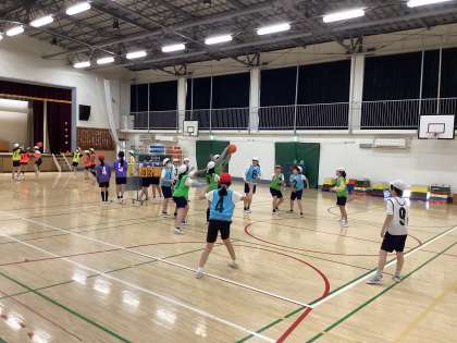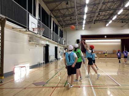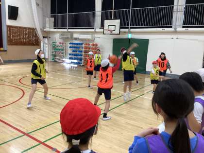 体育館ではバスケットボール型のゲームを行なっていました。「強いチームと対戦して1点差で勝ちました」と嬉しそうに話してきた児童に、勝てる理由を聞いてみました。「パスを素早く回せているから」「パスをもらえる様にスペースに動いているから素早くパスが回って、ポイントゲッターの僕の所へボールが来るからかなと思います」とのこと。学習を通して高めてきた個々の動き(技能)がチームの力となって発揮されていました。