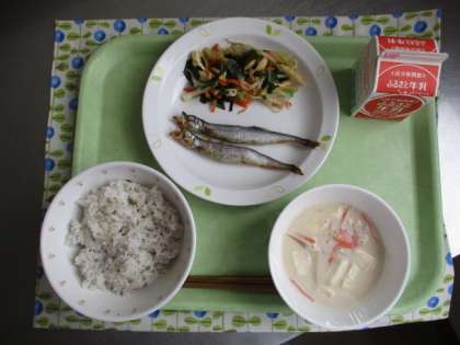 ししゃもは骨ごと食べることができる小魚です。成長期に摂りたいカルシウムがたっぷり含まれます。日本は魚の国です。昔から和食には欠かすことのできない食材、魚。おひたしを添え、ごはんとおみそ汁とともに味わいました。
