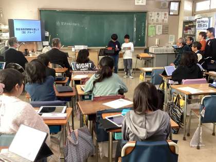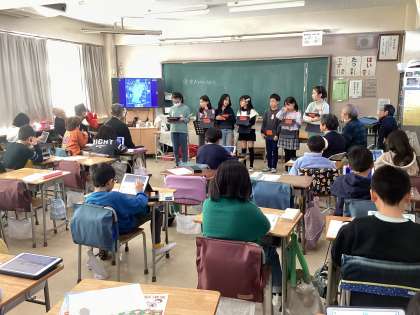 お世話になった城南環境学習支援グループの皆さんをお招きし、一年間のまとめの発表会を行いました。虫や鳥、魚や植物について、現地で調べたことや教えてもらったことを各グループでまとめて発表を行いました。ニュース仕立てや劇風など、発表方法を工夫して関心を惹く伝え方ができていました。楽しく学びを深められていたことが伝わってきました。