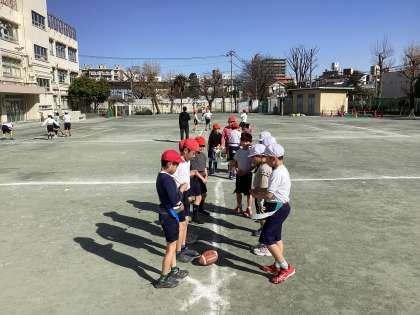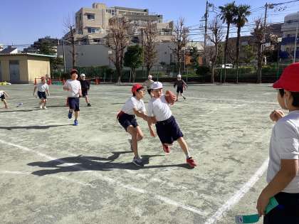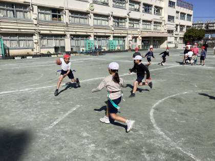 3年生の体育の授業ではタグラグビーを行っていました。リコーブラックラムズの皆さんにご指導を頂いてから3週間。授業でも数時間行ってきたこともあり、スペースを見つけての動きや素早いパス回しなど、板についてきました。