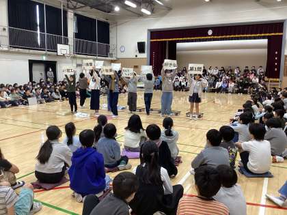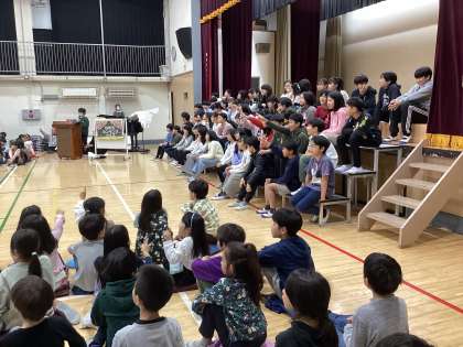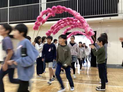 3、4時間目は「6年生を送る会」を行っています。「ひがたまフレンズ」の皆さんにお手伝いをいただいた2年生作の花のアーチで6年生をお迎えしました。ひな壇に座る6年生と皆で一緒にクイズから会が始まりました。