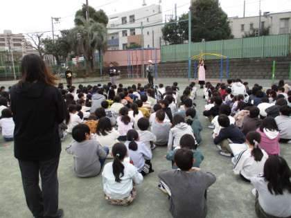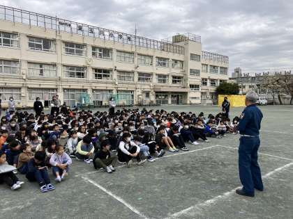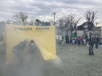 地震からの火災により校庭へ避難をした今日の訓練は、今年度の最後の訓練でした。静かに素早く避難をする様子から、これまで訓練してきたことが身に付いていることがわかりました。低い姿勢で鼻や口を押さえ、壁をつたって避難をするというポイントを教えていただき、4・5年生はその後の煙訓練を行いました。