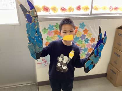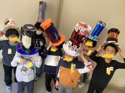 2年生の図工は色々な製作活動にチャレンジていします。今日は「翼」を作りました、という2組の子と、自分のテーマに沿ったオリジナルの帽子を作った3組の子が完成した作品を見せにきてくれました。思いを表現できた嬉しさが笑顔に現れていました。