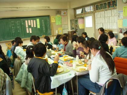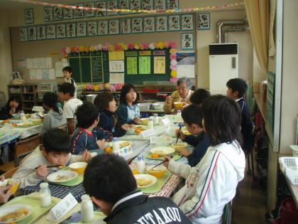 今日は近隣に在住するご高齢者の皆様をご招待して、給食会を開きました。2年生、4年生、5年生の各クラスにお招きしました。最初はみんな緊張した面持ちでお迎えしました。中には近所に住んでいる知り合いの方もいたので、だんだん楽しい話が弾むようになりました。寒い中、足を運んで頂きありがとうございました。