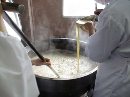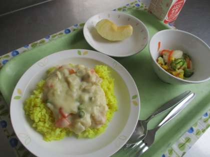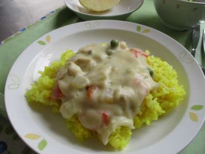 ターメリックで色をつけたご飯にえびやホタテが入ったクリースソースをかけました。仕上げのルウを入れるときはヘラを8の字に混ぜるそうです。そうすることでむらなく全体にとろみがつきました。