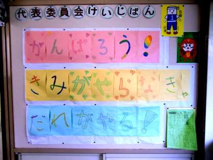 運動会の準備が進んでいます。代表委員会では、各クラスで話し合われた内容をもとに、今年度の運動会スローガンを決めました。「がんばろう! きみがやらなきゃだれがやる!」やる気いっぱいの子供たちです。5月26日が楽しみです。