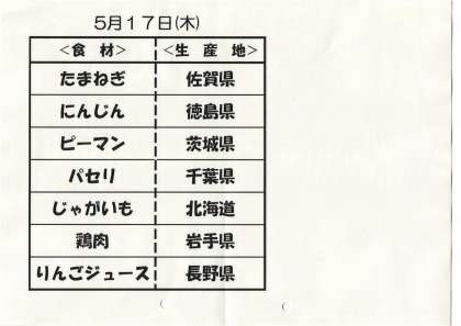 5月16日(水)の給食と17日(木)給食食材の産地について